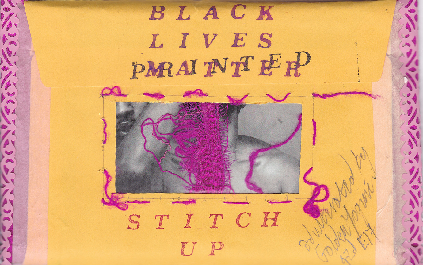 Golden Yogini, Black Lives (Printed) Matter (Stitch Up) (Sent to Velorose from London 20.10.20), Adulterated Set of Postcards from the ‘Ruins’ Exhibition Using Stamped Ink, Transparent Plastic, Pencil and Thread with Washi Tape and Decorative Adhesive Tape (Obverse), Unique, Not for Sale