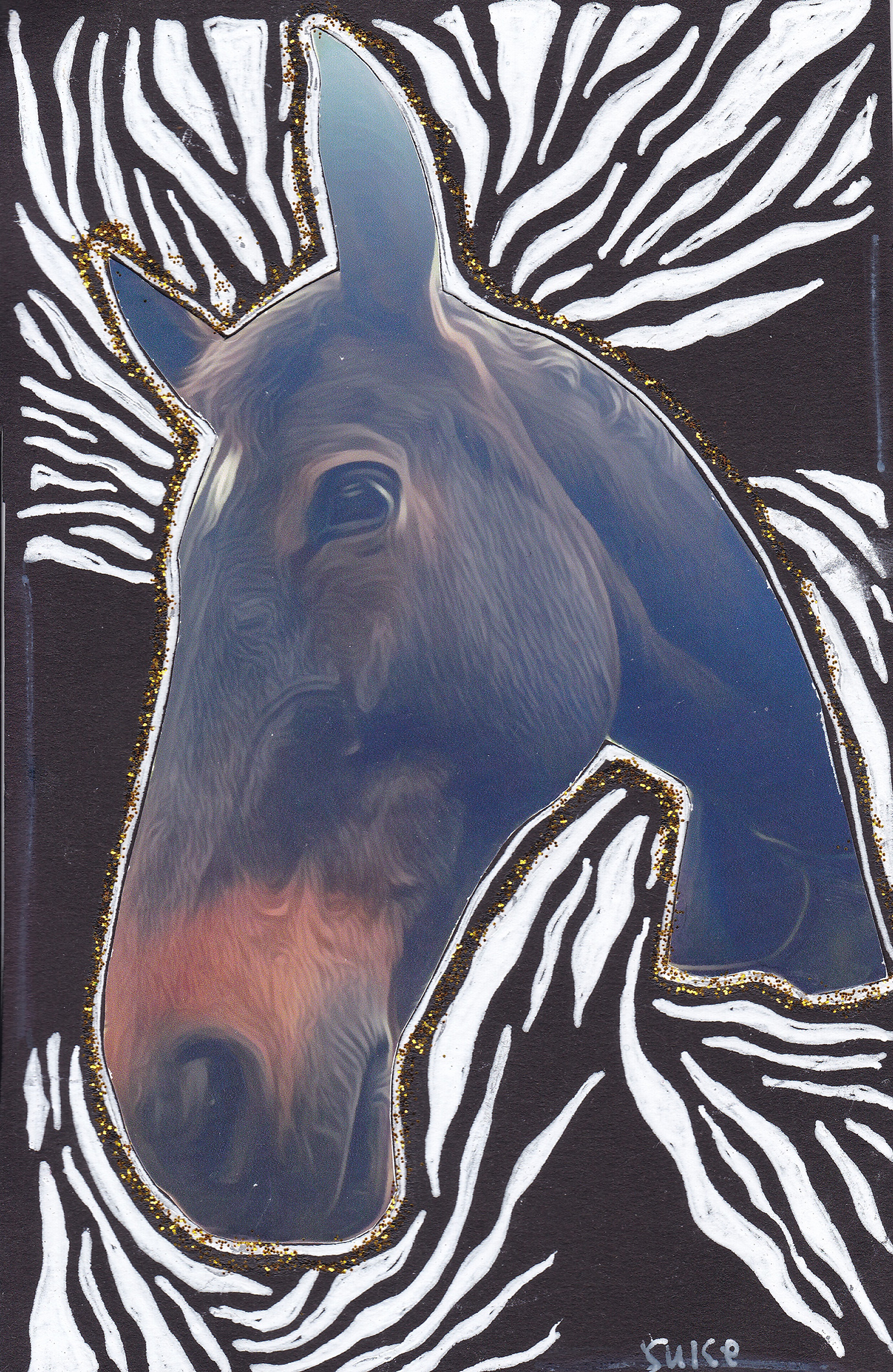 Suke Driver, Untitled (Black Beauty) (Sent to Velorose from London 2020), Magazine Paper Collaged on Paper with Glitter and White Pen, Unique, Not for Sale