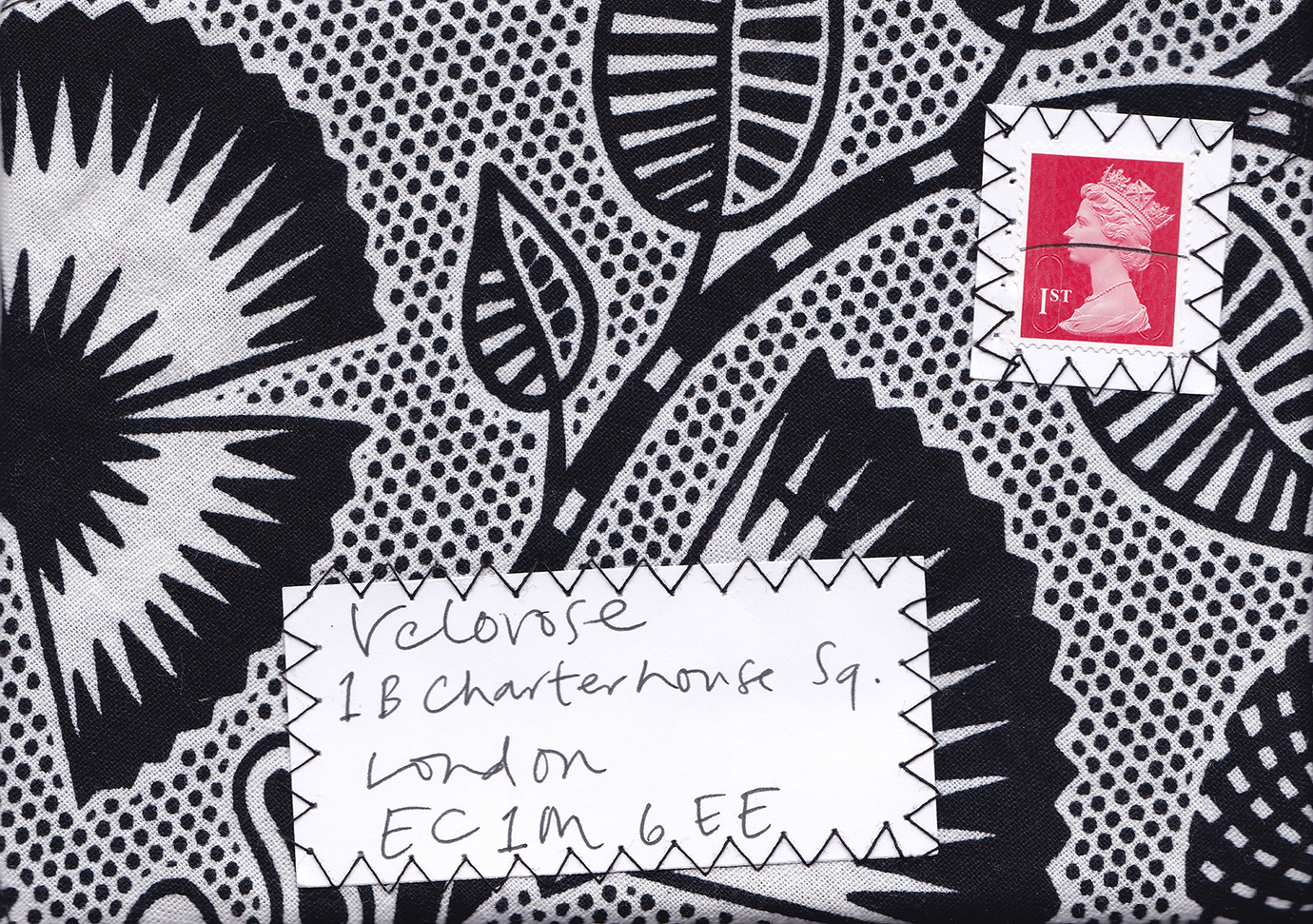 Sophie Carter, The Power of Black (Fabric) (Sent to Velorose from London 2020), Wax Print Fabric Envelope with Stitched Paper, Pen and Stamp (Cancelled with Biro) (Reverse), Unique, Not for Sale