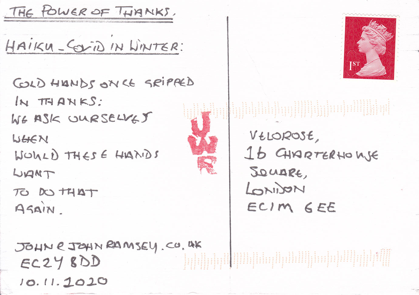 John Ramsey, Haiku - Covid in Winter (Postcard Sent to Velorose from London 2020), Pen, Rubber Stamp Ink and Stamp on Card (Reverse) (Unique) (Not for Sale)