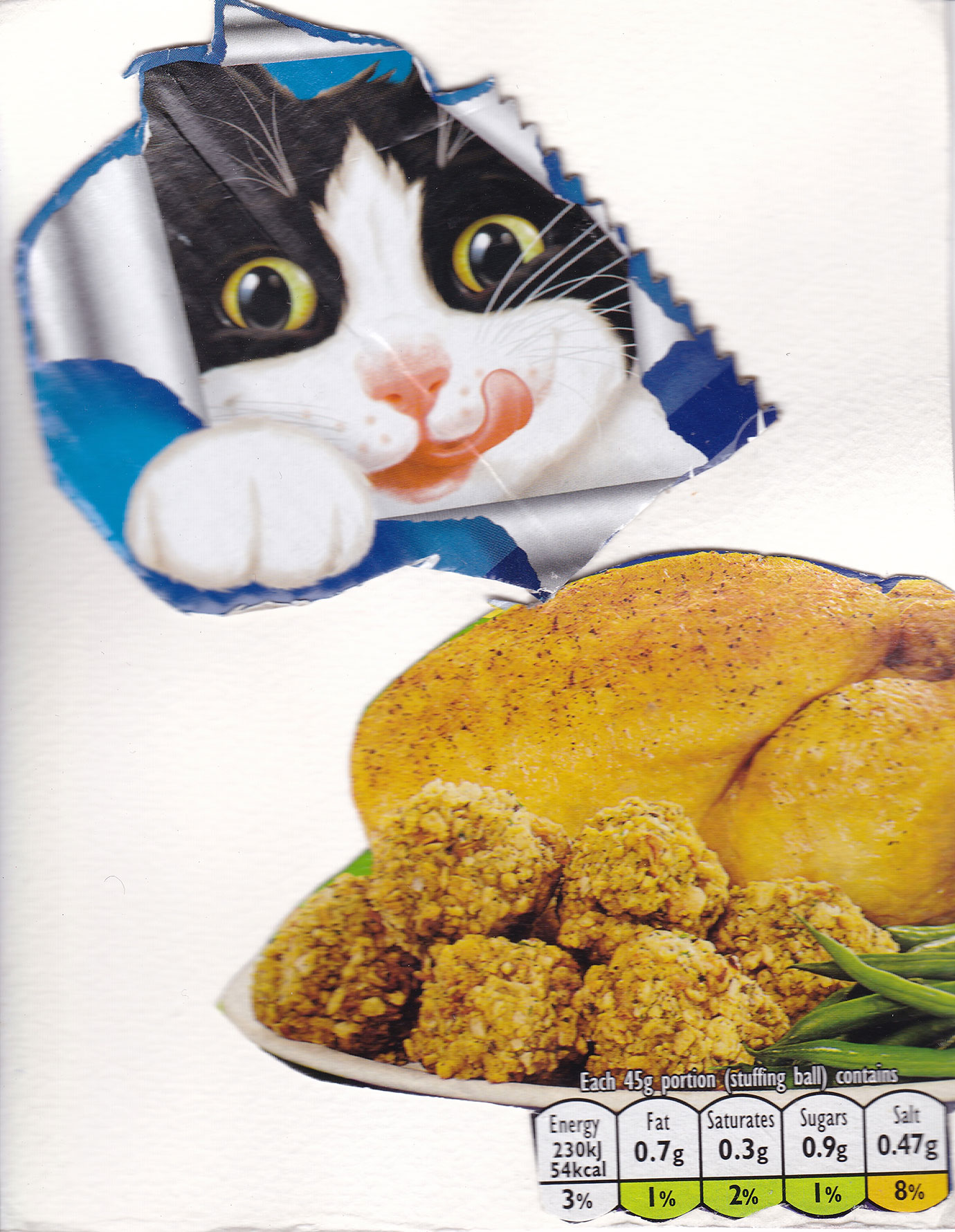 M, Collage of Cat & Chicken (Postcard Sent to Velorose from London 2020), Food Packaging on Watercolour Card (Unique) (Not for Sale)