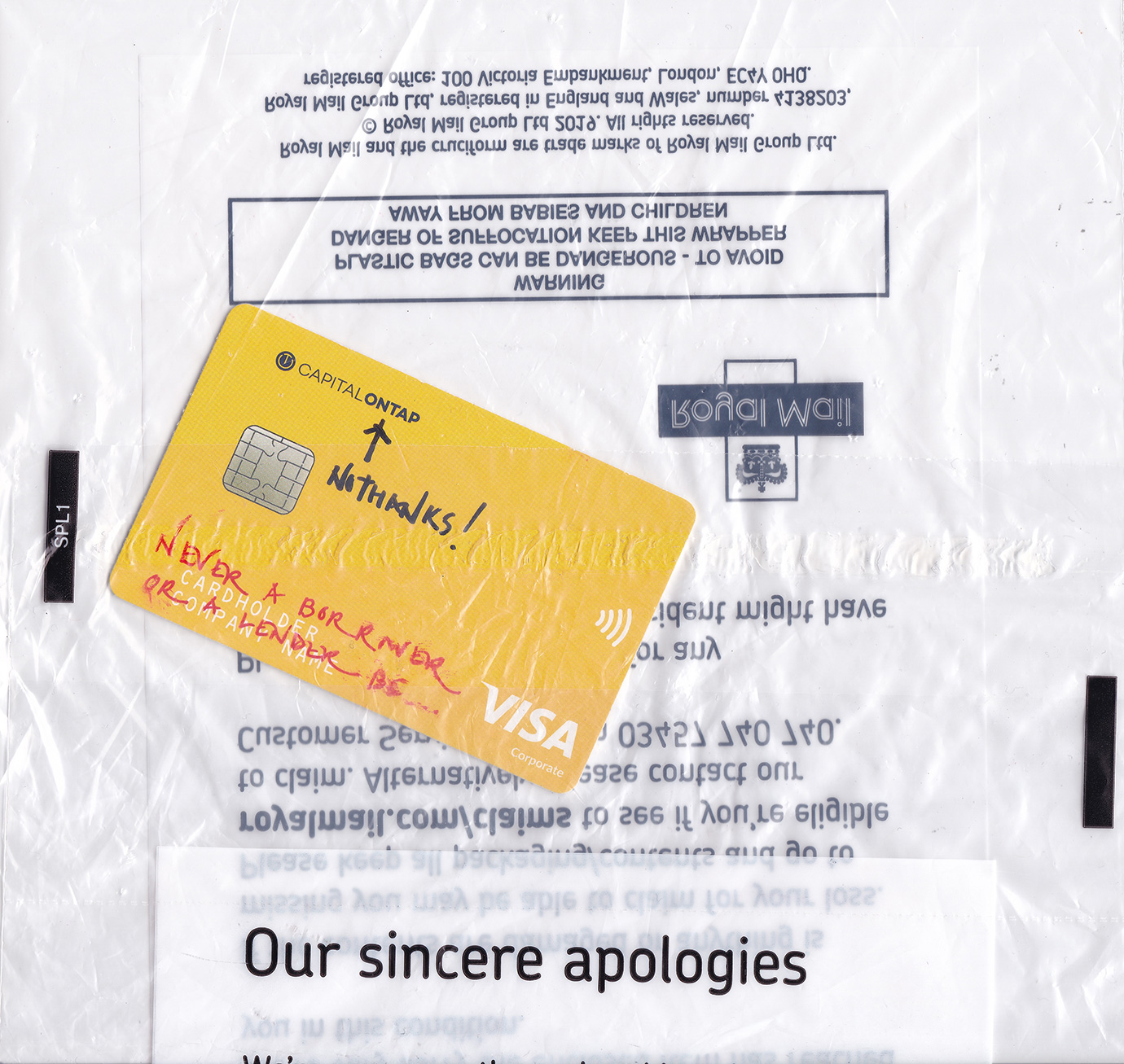 Anonymous / Royal Mail, Junk (Royal) Mail / No Thanks (Never a Borrower or a Lender Be) / Sorry not Sorry (Postcard Sent to Velorose from London 2020), Pen on Junk Mail in Sealed Royal Mail ‘Sincere Apologies’ Bag (Unique) (Not for Sale)