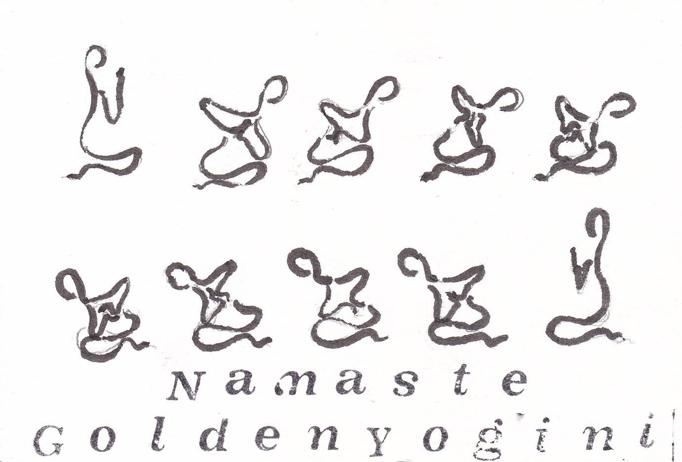 Golden Yogini, Namaste (Commemorating + Channeling of Yoga Mucha Moves) (Postcard Sent to Velorose from London 2020), Rubber-Stamped Ink on Watercolour Postcard (Unique) (Not for Sale)