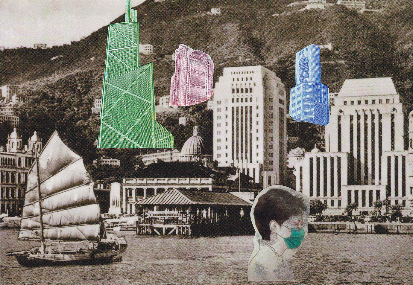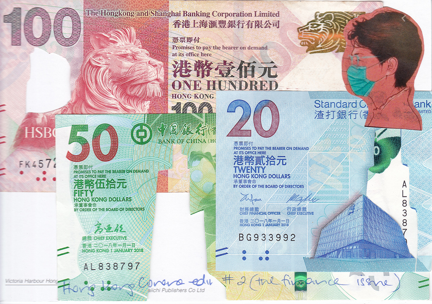 Ester Voy, Hong Kong Corona Edit #2 (The Finance Issue) (Postcard Sent to Velorose from Hong Kong 2020), Hong Kong Bank Notes and Magazine Paper Collage on Tourist Postcard (Obverse) (Unique) (Not for Sale)