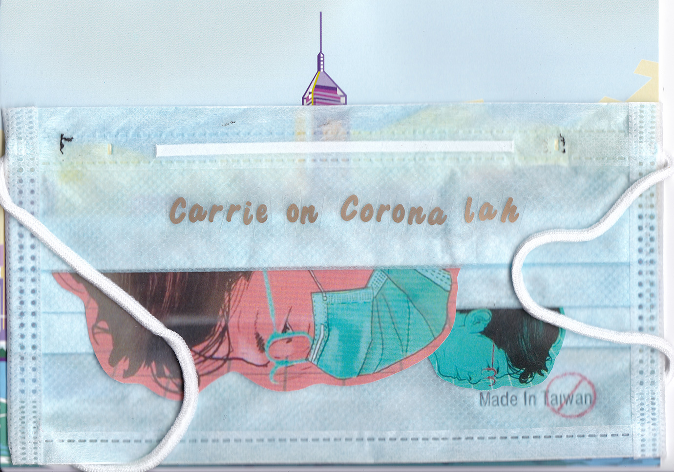 Ester Voy, Hong Kong Corona Edit #1 (The Health Issue) (Postcard Sent to Velorose from Hong Kong 2020), Adhesive Letters and Magazine Paper Collage on Face Mask on Tourist Postcard (Unique) (Not for Sale)
