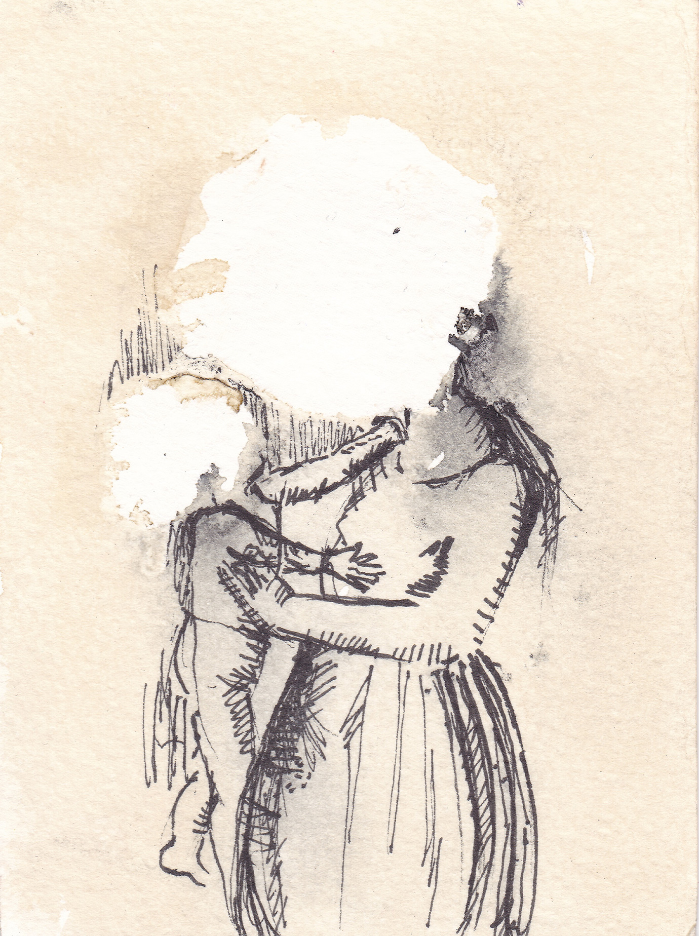 M, Mother + Child (Postcard Sent to Velorose from London 2020), Fineliner, Coffee and Gold Foil Sweet Wrapper (Delaminated / Missing) on Watercolour Paper (Unique) (Not for Sale)